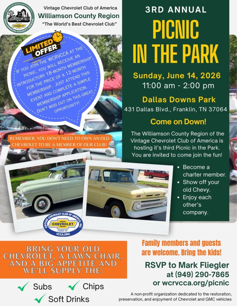 The Williamson County Region is a car club based in Franklin, Tennessee. In April 2024, the club received its charter from the Vintage Chevrolet Club of America, the premier Chevrolet and GMC club with regions and chapters across North America and worldwide.